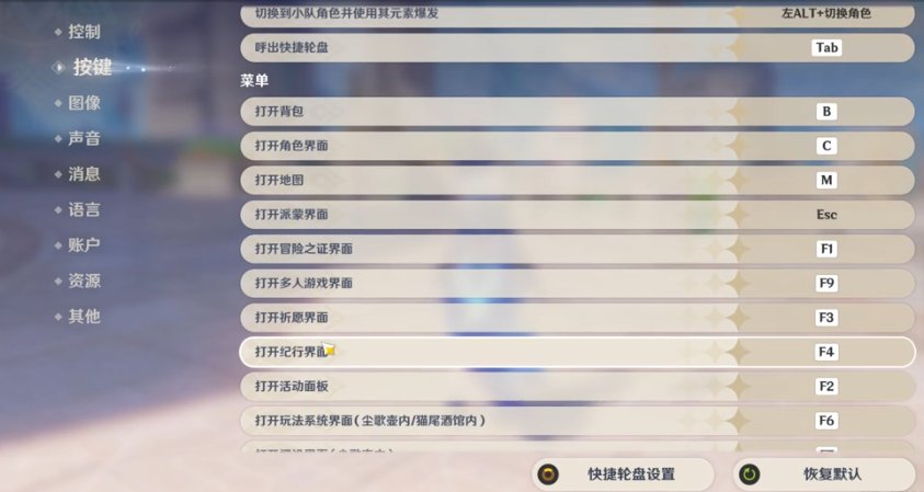 首先我们需要在设置里面对打开纪行界面进行按键设置,随便设置一个控制的按键