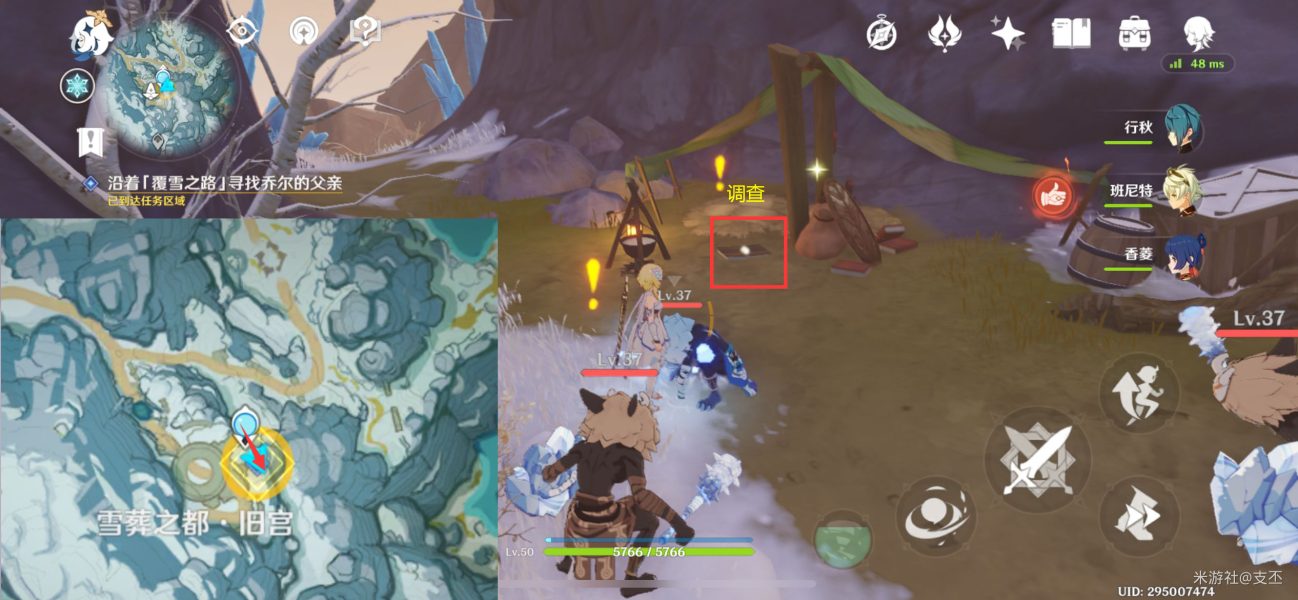 跟随指引,前往雪山西面的山坡营地处,用火元素角色攻击溶解冰块,然后交互调查“字迹端正的笔记”