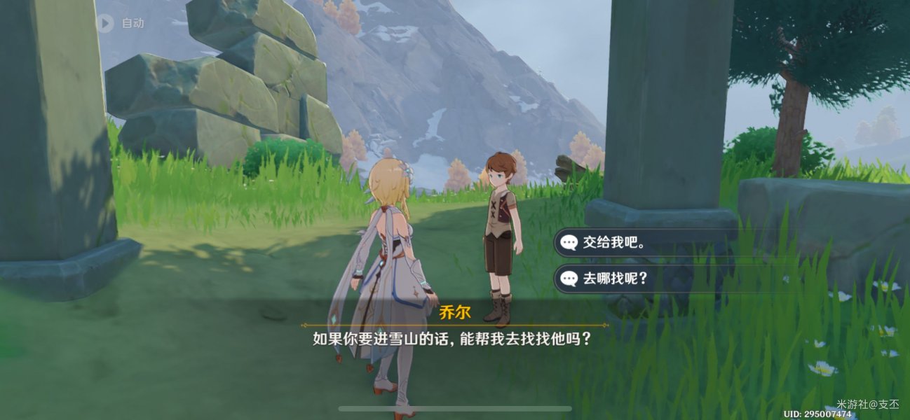 对话得知,乔尔在寻找父亲,自己无法前往,委托我们前往雪山帮忙寻找