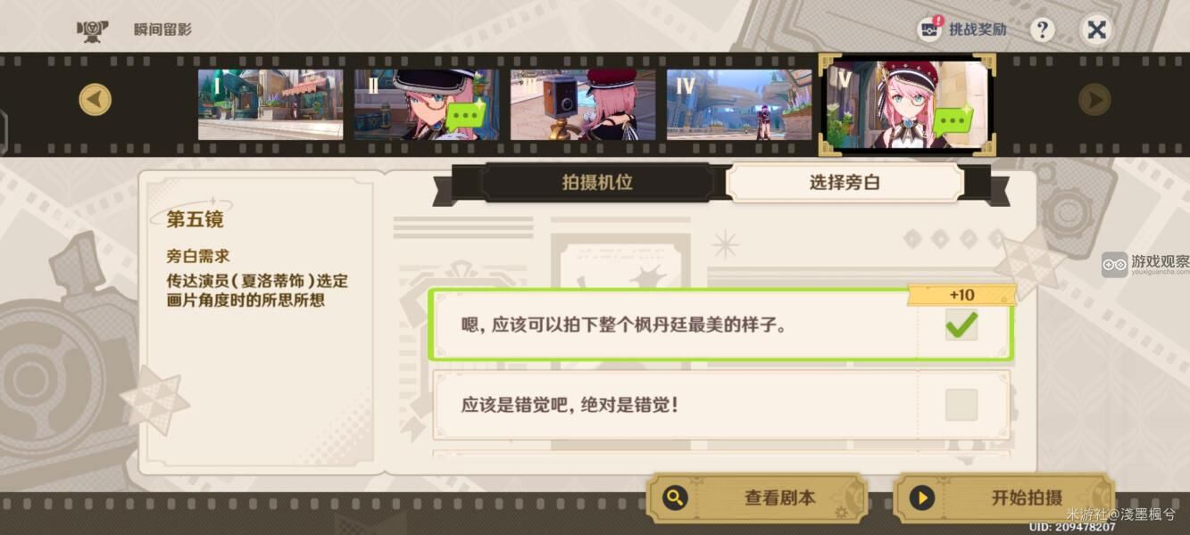 机位需求交代演员(夏洛蒂饰)正在构思留影内容,同时将枫丹廷风景包含在内