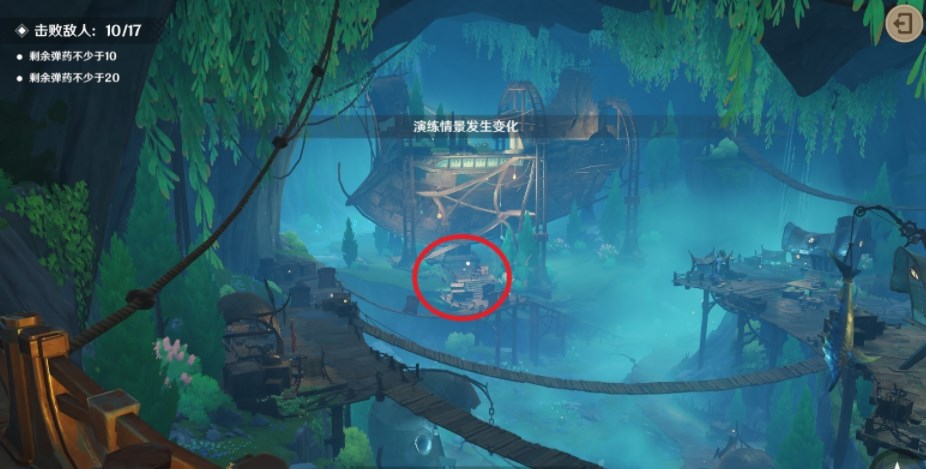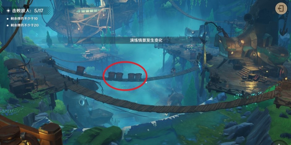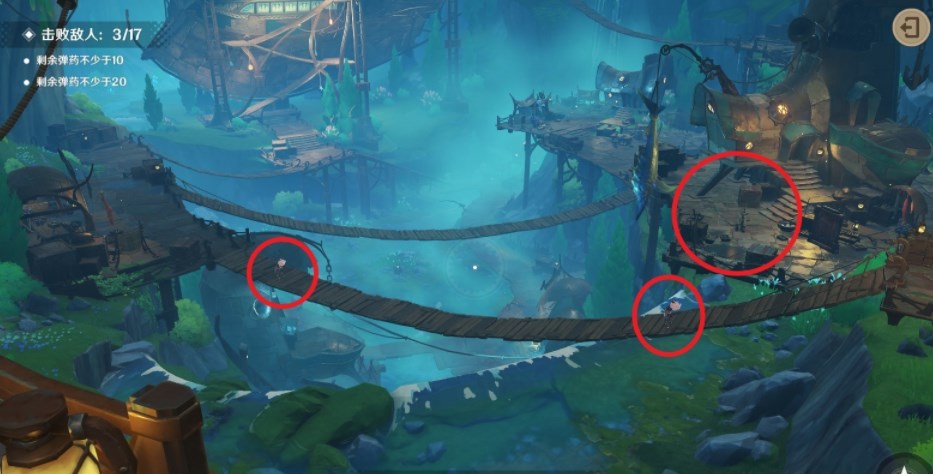 第二波的敌人在桥上,丘丘暴徒需要两枪才能击杀。除此之外还需要注意的是桥中间四个箱子后会有一个敌人来回移动,瞄准中间位置等它露头时再打。