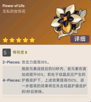 2、该圣遗物四件套时角色施放元素战技后的10秒内,岩元素伤害加成大幅度提升。