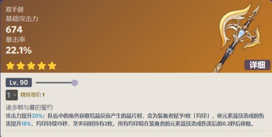 1、这把双手剑可以为角色退供非常高的白值,也可以利用基础暴击22%也可以使目标角色圣遗物选择性更为广泛。