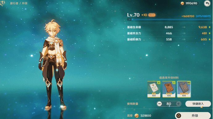 角色培养界面加快了培养相关特效的速度,并能使用快捷放入,一键放入能将角色提升到突破前的最高等级的角色经验素材。