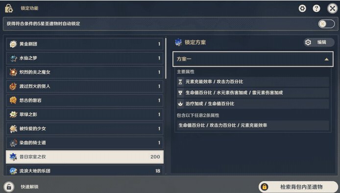 在"背包/圣遗物"界面,增加了自动锁定和快速解锁的相关功能,旅行者可以通过该功能对符合所选条件的圣遗物进行自动锁定和解锁。