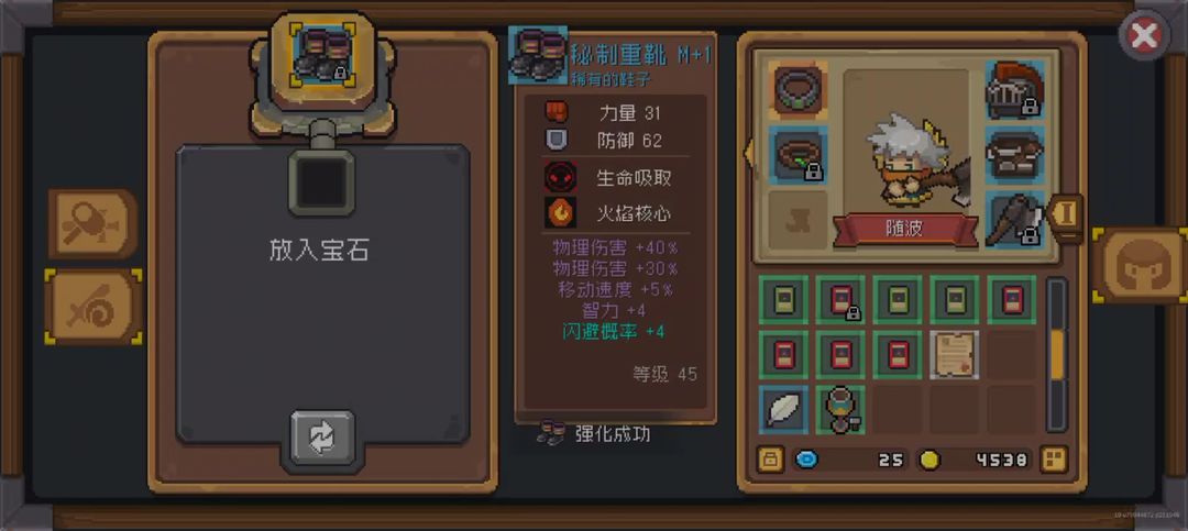 女铁匠,勾选左侧第二栏,放入装备,磨炼石,升阶成功,基础属性增加,羁绊加一。