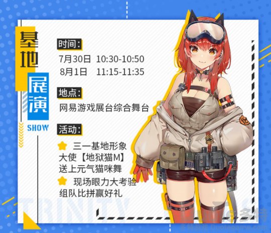 而在网易游戏展台综合舞台,总计将举办2场基地展演活动。分别将于7月30日10:30-10:50与8月1日11:15-11:35展开,想要参与互动的玩家请注意时间不要错过。本次舞台互动内容由两个环节组成,在第一个环节中,三一基地形象大使地狱猫M将为大家带来元气舞蹈;而第二个环节则为现场玩家准备了“眼力大考验”比赛,玩家上台组队比拼赢特典周边。具体玩法暂且保密,敬请各位玩家拭目以待。