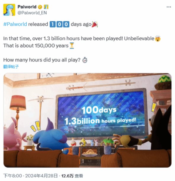 此外,官方在近期发文,庆祝《幻兽帕鲁》发售满一百天,并宣布全球玩家玩家的累计游戏时长已经突破了13亿小时,约等于15万年!不知道大伙贡献了多少时长呢?