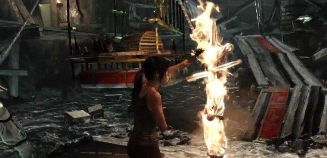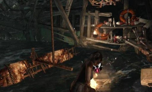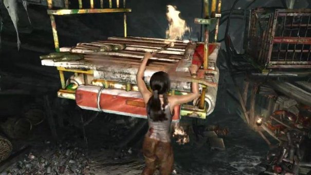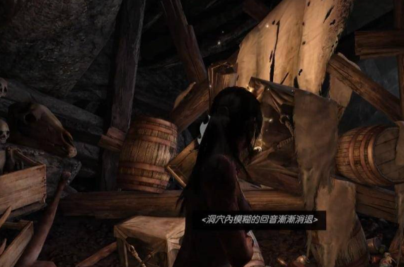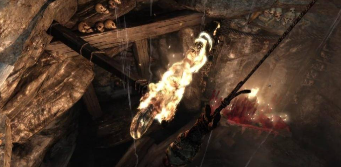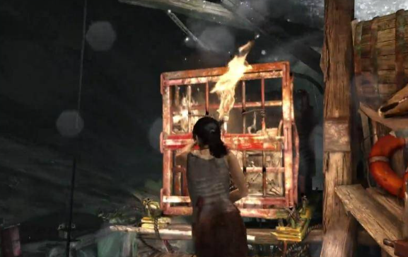 5、一段前行后,劳拉来到处于两面水帘之间洞穴,启用求生本能,好好利用场景中发亮物体逃出生天,重新拿到火后我们把前面拴住水闸两根木棒烧掉,之后水闸会落下,拦住经过货物。