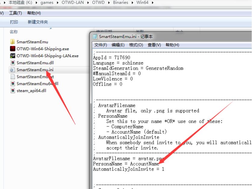 游戏目录必须是纯英文,改名才有用。游戏目录找到SmartSteamEmu.ini,用记事本方式打开,找到PersonaName = AccountName这句话,把“AccountName”改成自己想要的英文名字。