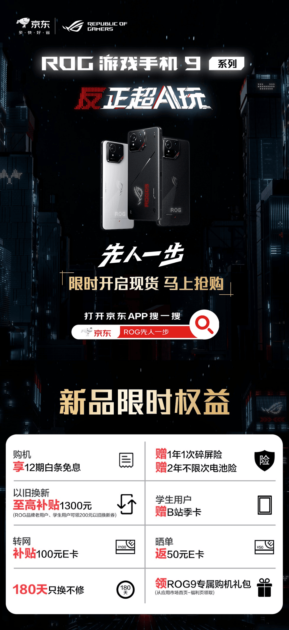目前ROG游戏手机9系列已经正式发布,ROG 9 12GB+256GB价格4999元、12GB+512GB价格5499元;ROG 9 Pro 16GB+512GB价格6299元、24GB+1TB价格8499元;酷冷风扇 X Pro价格599元;ROG冰川液冷壳价格299元。逛京东搜ROG 9,参与先人一步预约购机享12期白条免息,赠1年1次碎屏险、2年不限次电池险,学生用户可额外领B站季卡,现已开启先人一步,现货开抢最快明天可到手新机!