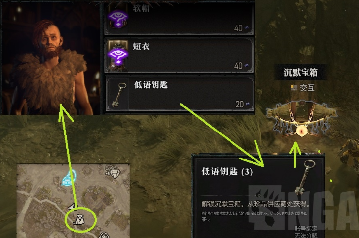 地图上会遇到一种沉默宝箱,需要用在赌博佬处用低语古币(血岩碎片,地图事件宝箱开出)买的低语钥匙开启,这个箱子的掉落相当于一个稀有怪,受地图难度影响,建议前期升级时不要开,等切换高难度地图了再开。