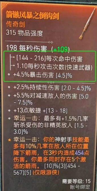 需要注意固定属性上方的秒伤属性(白色加粗部分),其实是根据下方单次伤害x每秒攻击次数计算出来的,仅供玩家参考,对于1个BD来说,不是秒伤越高武器就越好,还是具体根据词缀来考虑的。