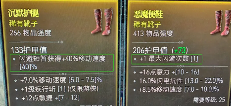 其中靴子的固定词缀除了【护甲】外,还有三种可能的词缀,也是三种鞋子的底材