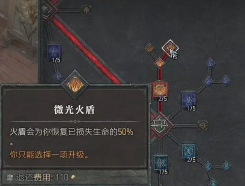 点出“微光火盾”,激活火盾时为你恢复已损失生命的50%,这个技能是法师的恢复保命神技,在打世界BOSS时非常好用。