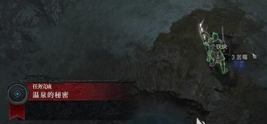 做完动作表情之后,就会出现一个宝箱,打开会获得1铁块和3苦梅的奖励,我们就可以完成温泉的秘密这个任务了。
