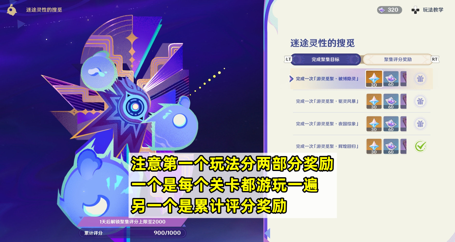 玩法是将游灵聚集至回归区,注意挑战分两部分奖励,一个是四个关卡全部游玩一遍,另一个是累计评分奖励,拿完奖励需要等后续关卡和累计评分奖励上限解锁