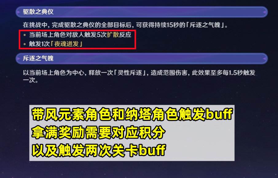 战斗玩法的挑战,第一关的关卡buff触发需要带上一个风元素角色和一个纳塔角色,另外注意拿满奖励需要获得对应分数外,记得触发两次关卡buff的效果