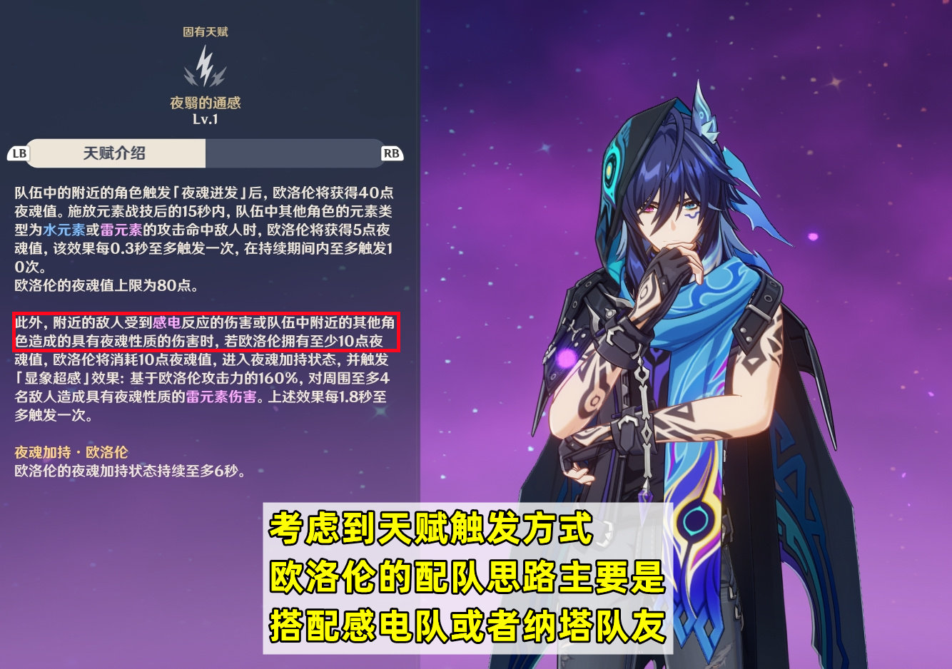 考虑到欧洛伦的天赋触发方式,他的配队思路主要是作为后台副C,搭配感电队或者纳塔队友。