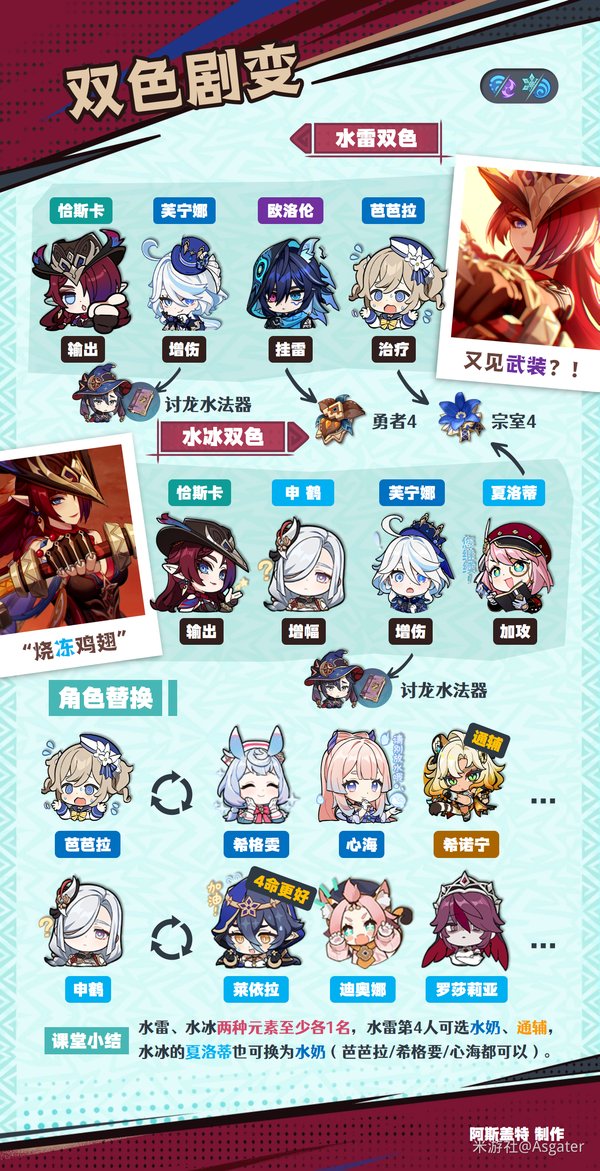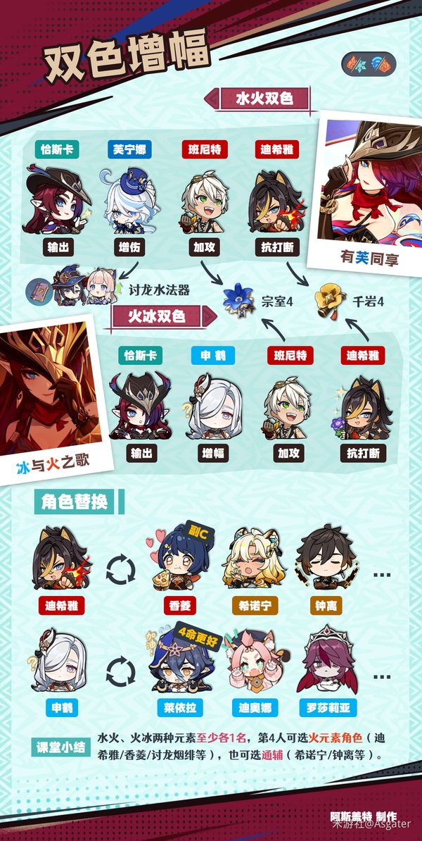 ④ 确保一水一火后,第四人即可选水/火队友,也可选希诺宁、钟离等泛用辅助。
