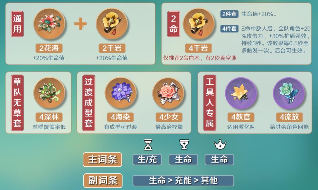 因生命值=治疗量+护盾吸收量+草相关反应的增伤,所以不用刻意去考虑治疗加成属性,只需一股脑的叠生命和充能即可,白术的治疗量完全够用的。