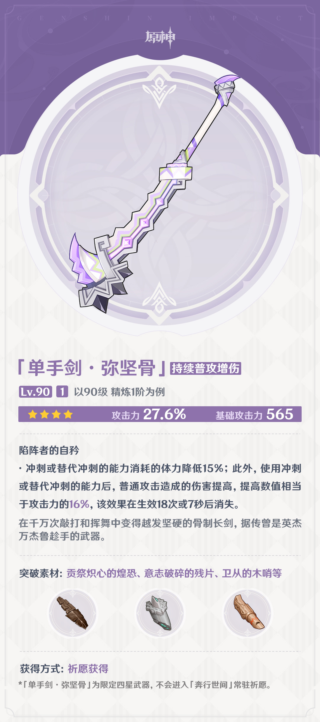 *「单手剑·弥坚骨」为限定四星武器,不会进入「奔行世间」常驻祈愿。