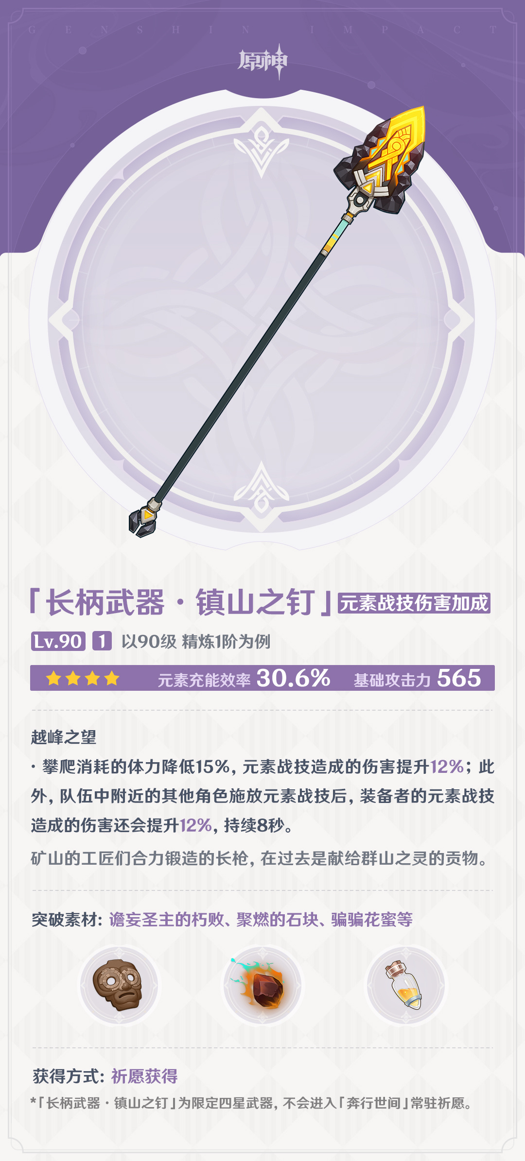 *「长柄武器·镇山之钉」为限定四星武器,不会进入「奔行世间」常驻祈愿。