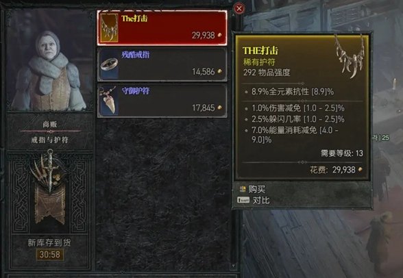在首饰匠旁边的就是首饰商人,在这位商人这里可以购买到戒指和护符,15级之后可以在这里刷到黄色戒指与护符。
