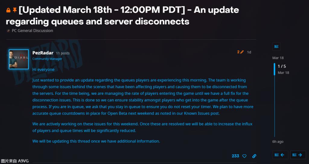为此《暗黑破坏神 4》社区经理 PezRadar 在暴雪社区上发布了一条公告,简要概括为团队正在积极为大家解决排队时间长、服务器断连等问题,确保大家游玩时的稳定性。