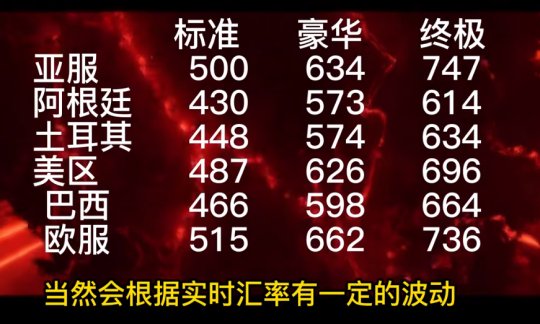 对于老玩家而言更推荐豪华版,可以正式服快人一步,熟练的玩家能轻松回本。对于新玩家,实惠的标准版和豪华版都可以,游戏无法在国内上线,其各个区的大致价格如下,当然会根据实时汇率有一定的波动。
