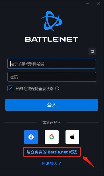 第三步:点击启动,进入战网登录界面。点击“建立免费账号”
