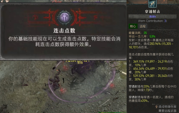核心技能推荐穿透射击,在所有的远程核心技能中只有它的AOE能力最强,无论是配合灌魔清理群怪还是点名心眼敌人效果都很不错。