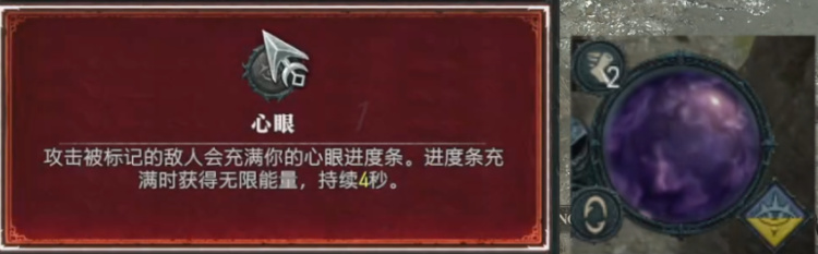 心眼这个专精系统选择之后,我们的能量条下面会出现一个眼睛标志,之后游侠会随机标记一名附近的敌人,攻击被标记的敌人可以增长心眼计数条,满盈之后游侠的能量会立刻回满,同时进入无线能量状态4秒。