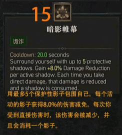 诡诈技能这里可选暗影帷幕,这个技能会提供比较高的减伤,后续强化还能根据层数提升移速或者暴击几率。