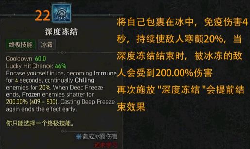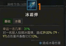 基础技能里个人比较推荐冰霜弹,它可以触发冻伤,置入附魔槽的效果是【攻击100%几率让敌人冻伤30%】,作为速冻的手段来说很不错。