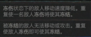 冰系法术大部分会附带冻伤效果,冻伤积累阶段敌人会减速,积累满之后才能冻结敌人。被冻结的敌人遭受一些其它攻击(比如近战物理攻击时)会受到额外伤害,然后冰雕碎一地。