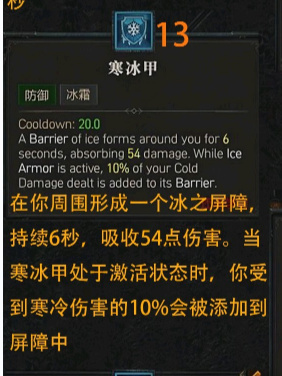 寒冰甲就是我们提到的回蓝手段之一,这个技能除了提供护盾外,还能在解锁后续的技能树后获得一个开启状态回蓝速度提升25%的被动。
