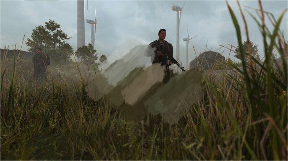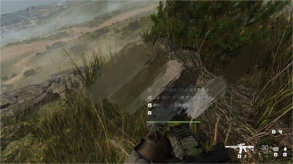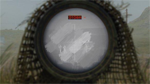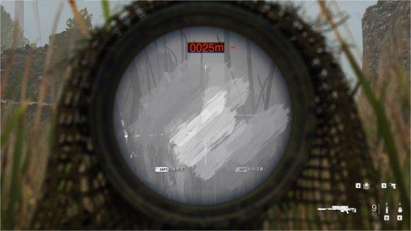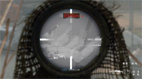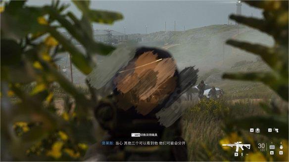 来到风力发电机旁的山坡上对远处的渔场进行侦查清扫,当准镜瞄准一个或一组敌人时,普莱斯会给出攻击指令建议以及弹道修正的提示,如果提示需要1发子弹同时搞定两个人时就需要起身往左右移动寻找最佳射击点位,当一切都准备好以后就可以进行射击。