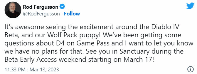 Fergusson 确认,《暗黑破坏神4》目前没有加入 XGP 的计划。