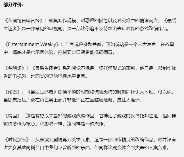 《最后生还者》真人剧集已于今日正式开播,目前本片烂番茄新鲜度98%,爆米花指数89%;M站均分84分,观众评分7.7分,目前共有52名观众对该剧集进行了评价,其中39好评,1中评,12差评。
