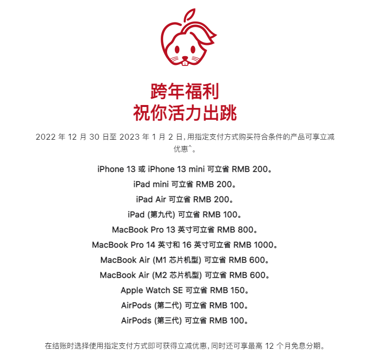 据苹果官网12月27日消息,为纪念即将到来的农历兔年,苹果中国现于官网开启了新一轮的“立减活动”,2022年12月30日至2023年1月2日用指定支付方式购买符合条件的产品可享立减优惠。