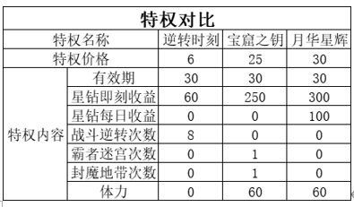 根据三大特权的内容,建议玩家进入游戏后的第一个月先把三大特权购买齐全。一个月之后,肝度高的玩家选择:宝窟之钥;不是非常肝的玩家或者想要攒钻的玩家选择:月华星辉。