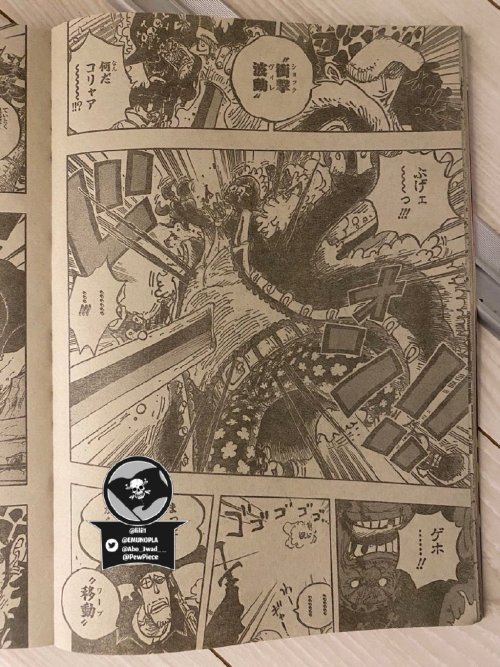黑胡子惊讶于罗已经觉醒,接着用了一个名为“震破”的震震果实的招式。本话里罗用了好几个觉醒状态的招式,包括“冲击波动”。