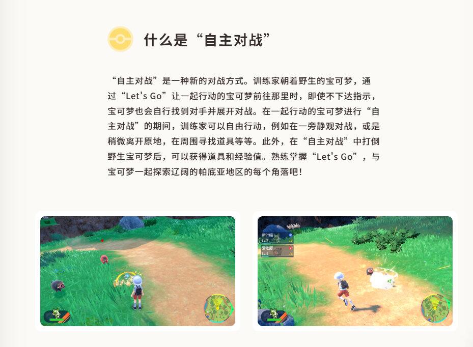 自主对战介绍:“自主对战”是一种新的对战方式。训练家朝着野生的宝可梦,通过“Let's Go”让一起行动的宝可梦前往那里时,即使不下达指示,宝可梦也会自行找到对手并展开对战。在一起行动的宝可梦进行“自主对战”的期间,训练家可以自由行动,例如在一旁静观对战,或是稍微离开原地,在周围寻找道具等等。