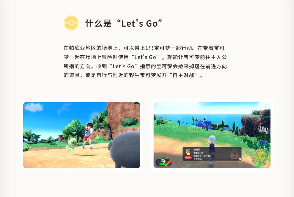 Let's Go系统介绍:在帕底亚地区的场地上,可以带上1只宝可梦一起行动。在带着宝可梦一起在场地上冒险时使用“Let's Go”,就能让宝可梦前往主人公所指的方向。收到“Let's Go”指示的宝可梦会捡来掉落在前进方向的道具,或是自行与附近的野生宝可梦展开“自主对战”。