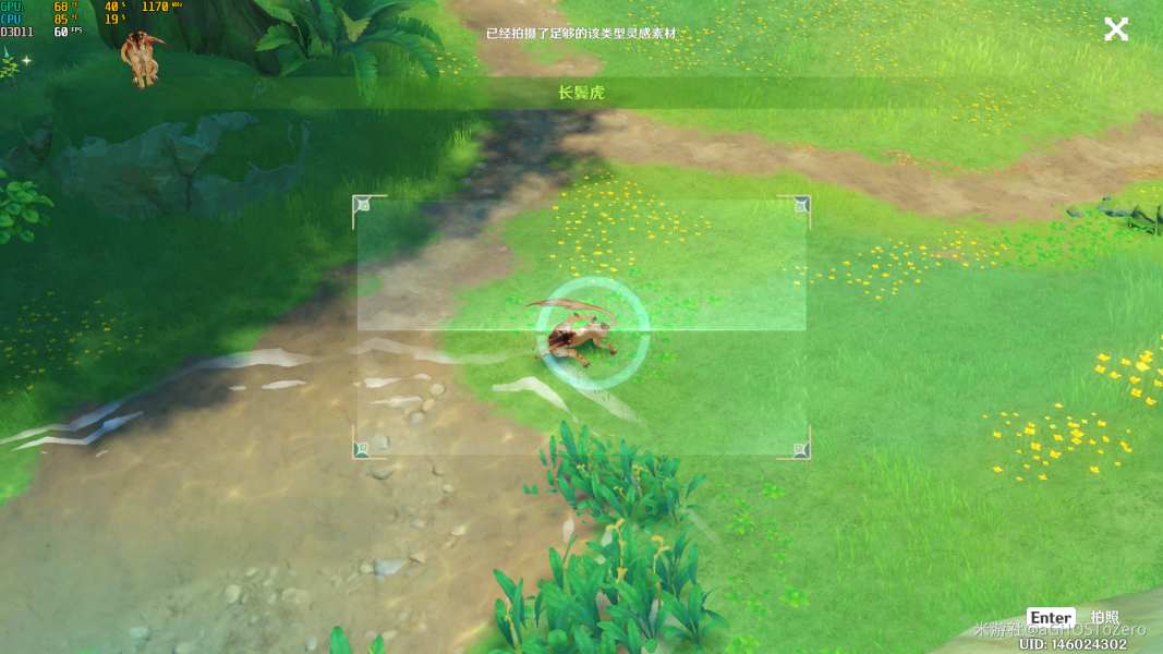 1、长鬓虎的推荐拍摄位置在恒纳兰那右边三岔路口,传送点往上走,走到山坡上拍就行了