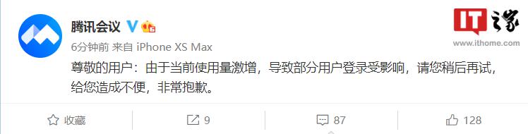 对此,腾讯会议回应称:“由于当前使用量激增,导致部分用户登录受影响,请您稍后再试,给您造成不便,非常抱歉。”