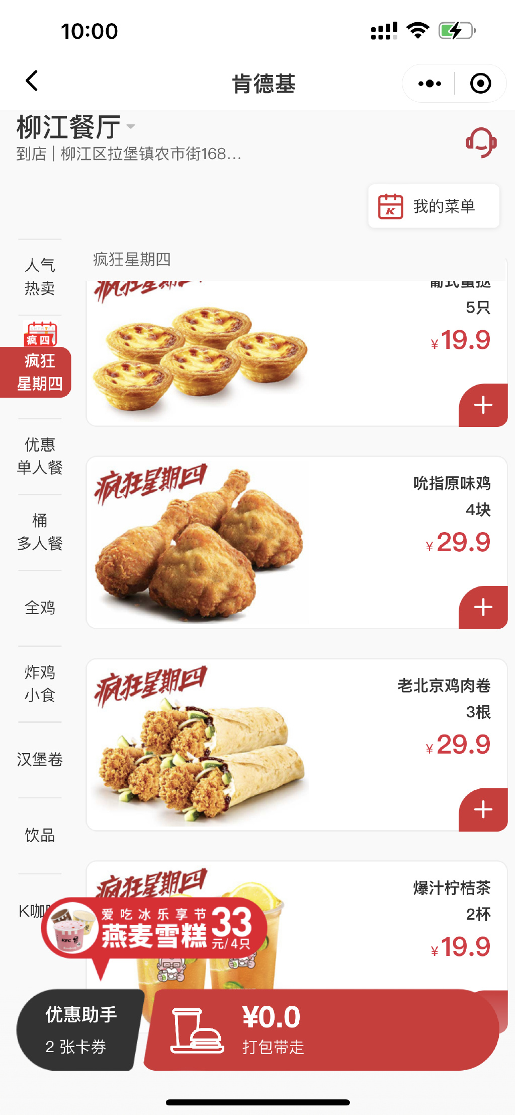 肯德基到底给了你们多少钱,每个星期四都要在朋友圈和群里问KFC疯狂星期四有无,还每个星期都要编新的段子,我就不信肯德基有这么大的魔力,v我五十,我今天亲自去肯德基看看