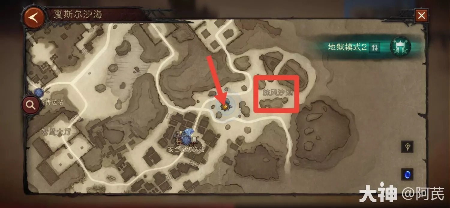 1.在掠风沙漠地图所示位置,找到npc着急的母亲,进行对话