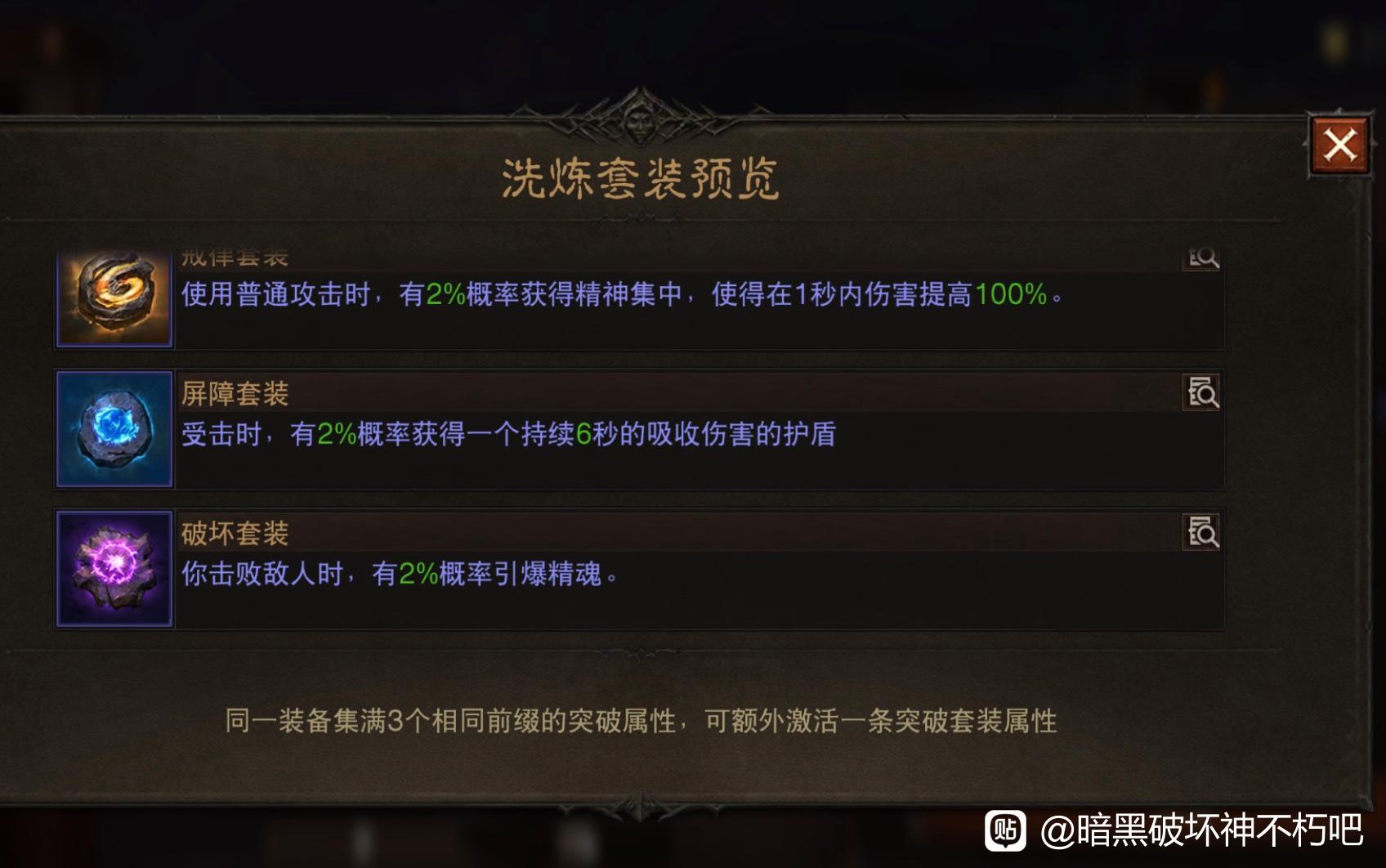 一件装备上的3个突破属性为同一前缀系列时,可以激活额外的套装奖励。
